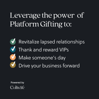 In addition to creating meaningful connections, gifting can be used as a tool to nudge prospects toward a decision. When someone is on the fence, a well-timed gift can give them the confidence they need to partner with you. For example, easily send them a gift through our Gifting Platform after a discovery call or a deal has closed.